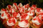 Tapetam o forma de chec cu folie alimentara. Piscoturile le trecem prin sucul stors din compot si cu ele tapetam marginile formei de chec. Taiem putin din fiecare piscot ca sa nu depaseasca marginea tavii.