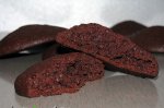 Incinge cuptorul la 190 ˚ C. Tapeteaza o tava cu foaie de copt. Intr-un vas amesteca faina cu cacaoa, praful de copt, si bicarbonatul. Intr-un bol bate untul cu zaharul. Incorporeaza oul urmat de smantana si ciocolata. Inglobeaza ingredientele uscate. Toarna aluatul obtinut in tava...