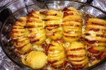 Se curata cartofii si se feliaza astfel incat baza sa ramana intreaga. Fiecare felie se umple cu cate o felie de costita.