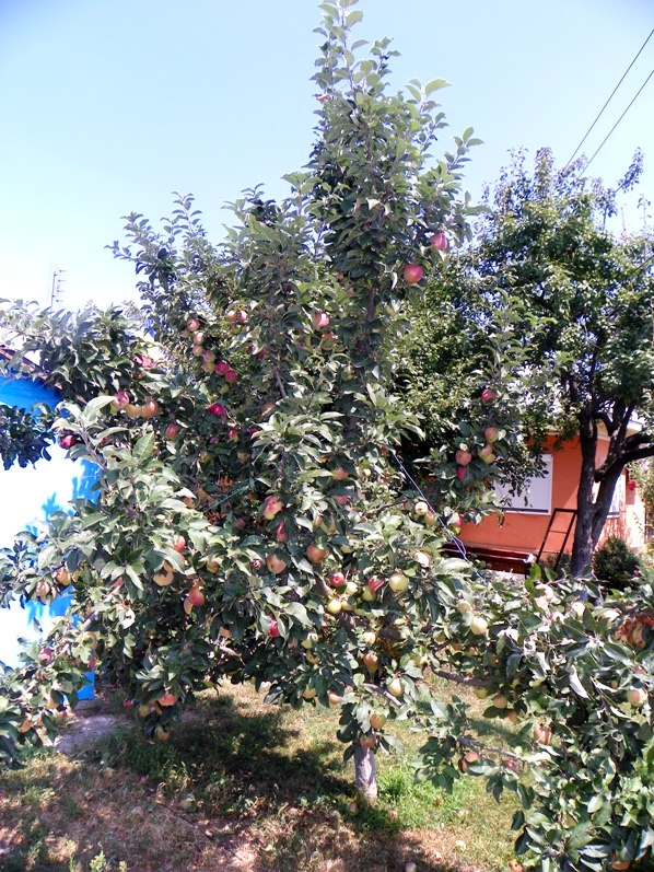 uite Merisoaro cum arata marul mamei in urma cu aproape o luna si jumatate.acuma sunt la fel de coapte(rosii) ca ale socrului tau.george a ancorat crengile de teama sa nu se rupa.astazi insa mi-a spus mama ca au cazut tare multe pe jos si multe crengi s-au rupt.