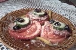 Decupam 3 cercuri din felia de paine , cu ajutorul unui pahar cu gura rotunda ; Punem pe fiecare cerc cate o bucata de rosie , de salam , castravete , masline taiate , sare ; Dam pe razatoare cascaval ; Punem intr-o farfurie si dam la cuptorul cu microunde 3 minute impreuna cu ardeiul murat...