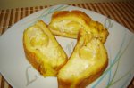 Pentru umplutura: se taie sunca bucatele mici si cascavalul se rade pe razatoarea cu ochiuri mici. Se amesteca sunca, cascavalul si branza de vaci si se potriveste de sare si piper. Se dezgheata aluatul si se intinde pe masa usor infainata. Se taie patratele si se pune in mijlocul fiecarui...