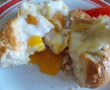 În găoace se pune o felie de cașcaval/brânză topită (sau 1/2, dacă chifla e mai mică), apoi o felie (sau 1/2) de șuncă presată, după care se pune un ou întreg.