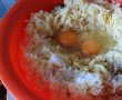 Se adauga faina si praful de copt si se amesteca din nou pana se incorporeaza toata faina. Cu mainile usor umede se formeaza bilute, cam cat o nuca mai mare apoi se trec prin pesmet.