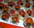 3.Se aseaza cate o jumatate de rosie cherry deasupra,o bucatica de maslina pentru capusor si bucatele mici pentru petele de deasupra.