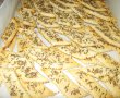 După acest interval de timp, se scoate aluatul din frigider și se întinde o foaie groasă de aproximativ 0,5 cm. Se taie fâșii late de 2 cm și lungi de 7-8 cm, după care se așează în tava prevăzută cu hârtie de copt.