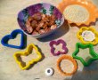 Intindem aluatul pe masa infainata si decupam stelute, inimioare, etc.,cu ajutorul formelor pentru fursecuri/biscuiti. La jumatate din forme, le decupam mijlocul cu o forma rotunda.