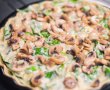 Intre timp se pregateste umplutura. Se spala spanacul si se opareste cu apa fierbinte pentru 2 minute. Se scurge bine. Se taie ciupercile si se calesc in ulei incins, se condimenteaza cu sare si piper dupa gust, usturoi granulat si oregano uscat. Se lasa 5 minute sa se inmoaie si se scurge zeama lasata. Se lasa apoi deoparte.