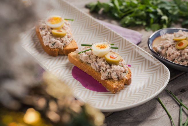 Pune pasta de ton pe felii de paine prajita si decoreaza cu jumatati de ou de prepelita, rondele de masline verzi si 2 fire de chivas.