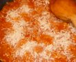 Punem apoi vasul cu ardei la cuptor, la 200 grade, timp de 30-40 minute pana scade putin sosul.