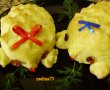 Se ia fiecare bucata si se da forma unei pere de exemplu apoi cu o foarfeca taiem si facem tepusi la arici,dupa care se pun ochisori din stafide si le prindeti cu scobitori altfel cad ,nasucul din ardei rosu tot cu scobitoare dupa care se ung cu galbenusul amestecat cu putin lapte,atentie sa nu culcati tepii.la mine s-au mai culcat......,se fac picorusele cate 2 la fiecare dintr-o bucatica mica si se cresteaza cu o foarfeca .
