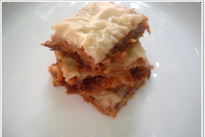 Foile se impart in 3 parti si se taie dupa marimea tavii(eu am facut in tava de la aragaz).Fiecare foaie se unge cu unt/ulei,iar dupa prima parte de foi se pune 1/2 din compozitia de nuci,alune(macinate),zahar si scortisoara,din nou foi unse,umplutura si ultimul strat de foi unse.