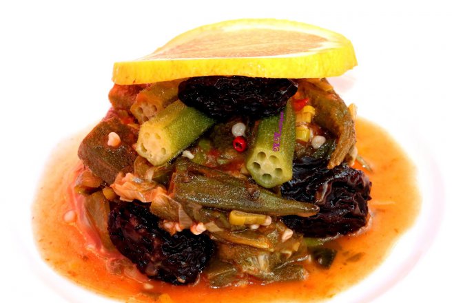 Curăţaţi, spălaţi şi tăiaţi bamele în 2-3 bucăţi, în funcţie de mărime. Spălaţi prazul şi pătrunjelul, Tăiaţi fideluţă prazul, apoi tocaţi pătrunjelul. Puneţi uleiul în cratiţă, iar, când s-a încins, adăugaţi prazul şi căliţi-l puţin. Adăugaţi bamele, un praf de sare, sucul de roşii şi lăsaţi ingredientele să fiarbă 10 minute. Adăugaţi perjele uscate şi mai lăsaţi ingredientele 5 minute la fiert. Când este gata, opriţi focul, adăugaţi piperul, turmericul, cardamomul, pătrunjelul şi amestecaţi toate ingredientele. Lăsaţi mâncarea acoperită încă 2 minute pentru a împrumuta din arome. Aşezaţi mancarea în farfurii şi adăugaţi sucul de lămâie peste ingrediente. Poftă bună!