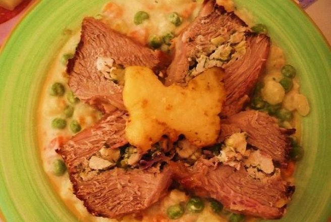 Se aseaza pe farfurie legumele cu crema si in mijloc se aseaza 4 felii taiate din ruloul de vita. In mijlocul lor se aseaza cartoful copt fluturas sau floare.