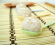 Se topesc impreuna ciocolata cu laptele si untul si se amesteca bine. Se dau bilutele prin aceasta glazura, apoi prin fulgi de cocos, dupa care se aseaza pe un platou si se pastreaza la frigider.