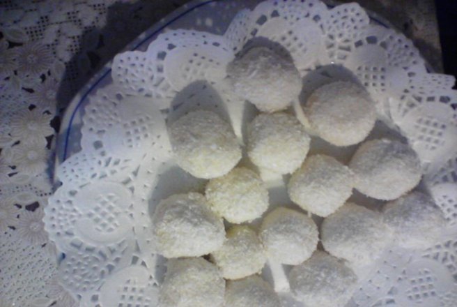 Modelati bomboane, cu cate o aluna de padure intreaga la mijloc si le dati imediat prin nuca de cocos.