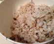 Ceapa se toaca marunt,se pune ulei de masline si zeama de lamaie,se amesteca bine si se adauga peste compozitia de cartofi.