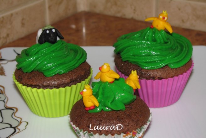 Intre timp se prepara pudding-ul cu laptele si zaharul vanilat bourbon comform intructiunilor de pe ambalaj apoi se incorporeaza colorantul alimentar verde.Se lasa sa se raceasca complet apoi se pune intr-un cornet.Se decoreza briosele cu pudding si animalute din fondant.