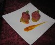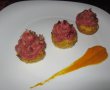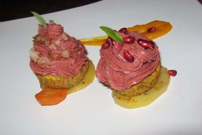 Facem bucatile de bacon crispy dandu-le la cuptor, dupa care le vom taia cubulete mici, acestea si boabele de rodie vor fi ornamentele pentru briose. Dupa care ne vom apuca de aranjarea preparatului nostru final ca in imaginile alaturate.