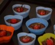 Distribuim uniform compozitia in formele de cupcakes, si in mijlocul fiecareia punem o capsuna.