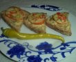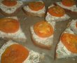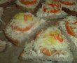 Asezam peste fiecare felie unsa cate o felie de rosie, presaram cascaval ras, apoi marar uscat iar la final feliute de ardei.