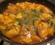 Intre timp se curata cartofii, se taie cubulete si se adauga la amestecul de carne. Se mai lasa la fiert cca. 20 de minute, completandu-se cu apa. Spre final se adauga bulionul si verdeata tocata marunt, lasandu-se sa mai fiarba cca. 10 minute.