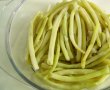 Fasolea se fierbe 8-10 minute in apa cu sare. Se pune intr-o sita si se lasa sa se scurga de apa. Ouale se bat bine cu sare,vegeta, piper si se amesteca apoi cu sucul de rosii, 2 linguri cu pesmet si verdeata tocata marunt.
