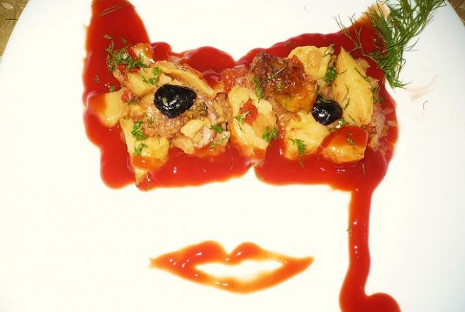 Apoi presaram si grauntii de usturoi taiati in 3 si apoi bucatele marunte de rosie, maslinele felii mari, bucheteleul de brocoli sfaramat peste tot si mararul si cascavalul deasupra din loc in loc.unem cam un polonic de amestec de vin cu pasta de tomate si putina apa. Presaram sare mare si rasnim piper negru proaspat.Bagam vasul in cuptorul rece neincins dinainte si dam drumul la foc la inceput mai mic apoi spre sfarsit dam focul mare si luam capacul ca sa se rumeneasca.