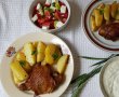 Fiind carne de curcan crescut la tara, procesul de gatire este mai lung si pentru asta am ales sa folosesc punga pentru cuptor pentru a se gati mai repede. Pe langa carne am facut o garnitura de cartofi aromati, o salata de rosii cu fetta si un sos tzatziki. Un deliciu!