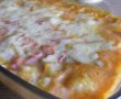 Se ia vasul de pe foc,se adauga castravetii,sunca,smantana,cartofii,sare si piper si se toarna compozitia intr-o tava unsa cu putin ulei.Se niveleaza.