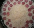 Se curata cartofii,se taie cubulete si se pun la fiert in apa cu sare si vegeta,20min.Se face un piure cu lapte si margarina,vegeta.Se fierb ouale 15min si se curata,se taie rondele.setaie feliute cabanosul.Se rade cascavalul si telemeaua.se tapeteaza un vas termorezistent cu margarina si pesmet.Se pune in el un rand de cartofi.unul de cabanos apoi de branza si apoi inca unul de cartofi.La sfarsit se pune cascavalul ras,cateva cubulete de margarina si 2-3 lingurite de smantana.Se da la cuptor 20-30 min,pana se rumeneste compozitia