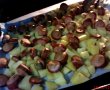 Cand sunt gata, scoatem tava din cuptor si asezam peste cartofi feliile de branza topita.