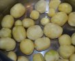 Pui la fiert apa cu sare. Cureti cartofii de coaja, ii speli bine si ii pui la fiert in apa cu sare. Ii lasi sa clocoteasca 10 minute, apoi ii scurgi bine de apa si ii pui la calit, in ulei incins. Toci usturoiul si mararul si le adaugi peste cartofi. Ii lasi sa se rumeneasca frumos.