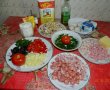 Toate ingredientele calite si cele taiate se adauga peste compozitia cu faina. Sare si piper nu punem foarte mult pentru ca se regasesc si in ingredientele folosite.