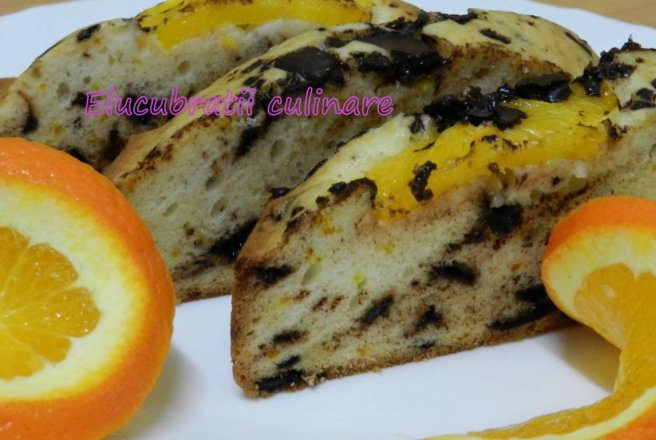 Compoziția se pune în două tăvi de chec unse cu unt. Deasupra fiecărui chec punem jumătăți de felii de portocală și presărăm restul de ciocolată. Se coace la 180 grade C pentru 45-50 minute. Se face testul cu scobitoarea înainte de a-l scoate din cuptor (e gata când scobitoarea iese curată).