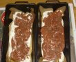 Se tapeteaza 2 tavi de chec cu hartie de copt,se pune mai mult de jumatate de compozitie in amandoua.Restul de compozitie se amesteca cu cacao si bucatile de ciocolata si se pune pe deasupra,apoi se amesteca usor cu o furculita.