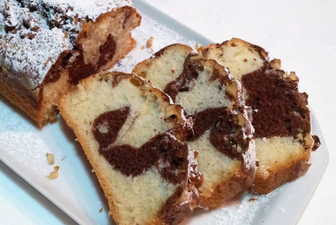 Punem o parte din compozitie intr-o tava de chec tapetata cu hartie de copt,iar in compozitia oprita punem lingura de cacao.Omogenizam si punem compozitia cu cacao in tava peste cea alba si cu o furculita facem onduleuri.