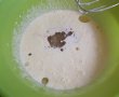 Mixezi ouale, cu zaharul, pana ce zaharul se topeste, iar ouale se albesc. Adaugi laptele sau cafeaua, esenta si uleiul, continuand sa mixezi. Cerni faina direct peste compozitia lichida, impreuna cu praful de copt. Omogenizezi.