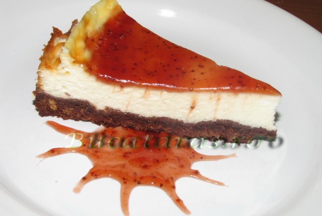 Pentru umplutura, se amesteca in vasul de la robot toate ingredientele, pana se obtine o compozitie cremoasa. Se toarna peste blatul de biscuiti si se coace la foc mic pana se rumeneste usor deasupra. Se lasa apoi la racit, se indeparteaza inelul si se pune la frigider cel putin o ora. Se unge cheesecake-ul cu sosul de capsuni, se poate decora cu frisca si capsuni proaspete.