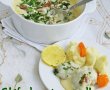Bagi vasul la cuptor (cuptorul preincalzit) pentru 20 minute, scoti vasul, pui zeama de lamaie si patrunjel verde tocat si bagi inapoi la cuptor pentru 10 minute.