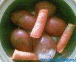 se pun cartofii si morcovii la fiert, dupa ce au fiert ii curatam si ii zdrobim cu furculita, atat cartofi, cat si morcovii, separat amestecam ouale cu branza, smantana, condimentele si verdeata, punem compozitia formata peste cartofi si amestecam bine.