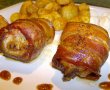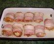 Se ruleaza fiecare ciocanel intr-o felie de bacon si se prinde cu o scobitoare.