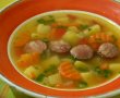 Dupa 15-20 minute se aduga carnatii si cartofii taiati cuburi potrivite [ o bucata de cartof trebuie sa incapa cu usurinta in lingura+ putina zeama ].Se fierb cam 15 minute .