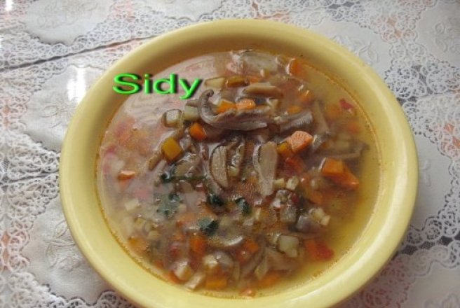 Morcovii, ceapa, ardeiul curatate si taiate marunt se calesc in putin ulei. Se adauga apoi rosiile taiate cubulete si patrunjelul taiat cubulete. Umplem oala cu apa si adaugam apoi ciupercile taiate fasii. Lasam sa fiarba toate legumele, potrivind gustul de sare piper si vegeta.
