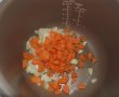 Curatam legumele, le spalam si le tocam cubulete, apoi le punem in vasul de la multicooker, impreuna cu 3 linguri cu ulei si un praf de sare, sa se caleasca usor pe programul fry ( fara a pune capacul ). Cand ceapa devine translucida apasam butonul warm/off.