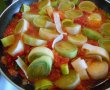 Se spală roșiile, se taie cubulețe și se pun în tigaia cu celelalte legume, ca să se înmoaie bine. Când lichidul lăsat de roșii a mai scăzut puțin, se adaugă rondelele de praz și se lasă la foc mic, acoperit, timp de 8-10 minute, până ce se înmoaie.