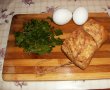Pana cand fierbe zeama cu salata, pregatim o omleta cu slanina afumata. Prajim feliutele de slanina si turnam deasupra cele doua oua batute (cu sare si piper dupa gust), trebuie sa obtinem o omleta (papara) de consistenta tare.