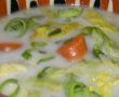 Prajiti foarte usorin ulei , prazul si morcovul taiat rondele + slaninuta feliute subtiri.