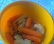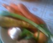 Intre timp curatam ceapa , morcovii,pastarnacul , telina si le adaugam in oala intregi .