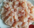 Căliți la foc mic cubulețele de piept de pui, până ce se albesc.